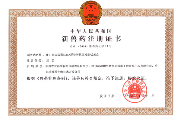 2016年2月25日,農業部發部第2366號公告,由中國農業科學院哈爾濱獸醫研究所(以下簡稱哈獸研)、哈爾濱動物生物制品國家工程研究中心有限公司(現更名為哈爾濱國生生物科技股份有限公司,以下簡稱工程研究中心)和哈爾濱維科生物技術開發公司3家單位聯合研發的禽白血病病毒ELISA群特異抗原檢測試劑盒,經農業部新獸藥審查合格,頒發新獸藥注冊證書(2016新獸藥證字15號)。該項目主要由中國農業科學院哈爾濱獸醫研究所王笑梅研究員為首席的禽免疫抑制病團隊研制,由工程研究中心承擔主要孵化工作,最終研制成功。該證書也是自工程研究中心成立后獲得的第2個新獸藥證書。