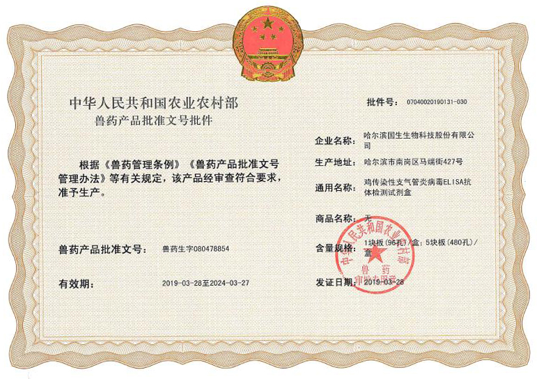 熱烈慶祝我公司獲得雞傳染性支氣管炎病毒ELISA抗體檢測試劑盒批準文號